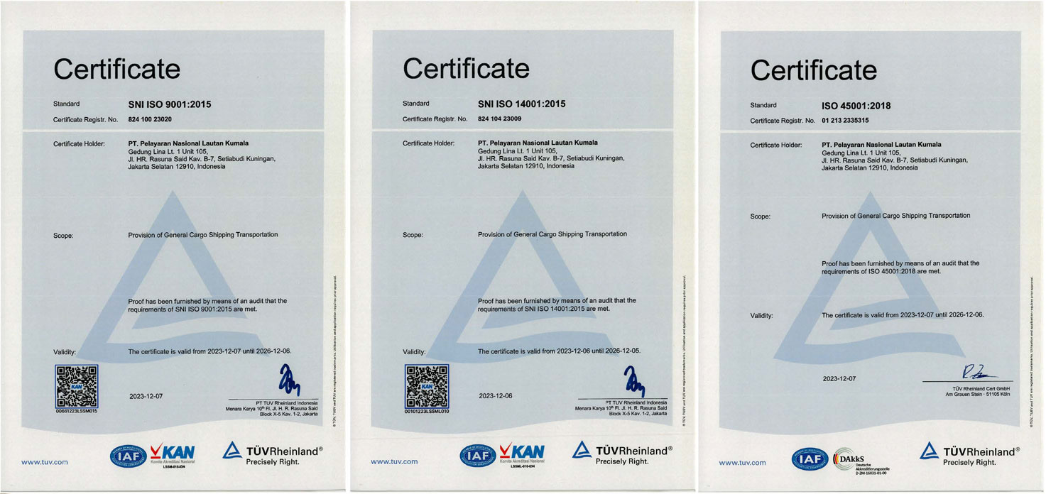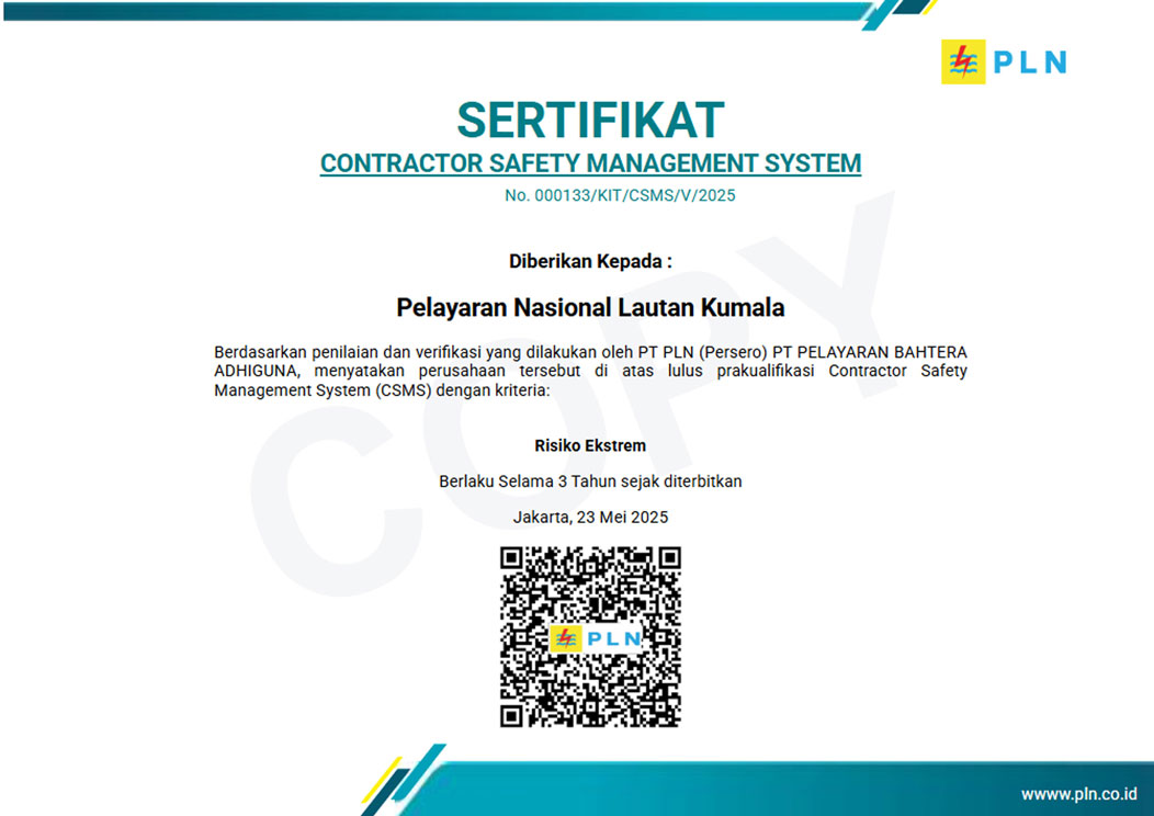 Based on the assessment and verification carried out by PT PLN (Persero) PT Pelayaran Bahtera Adhiguna, it was stated that the above company passed the prequalification for the Contractor Safety Management System (CSMS) with the Extreme Risk criteria.
