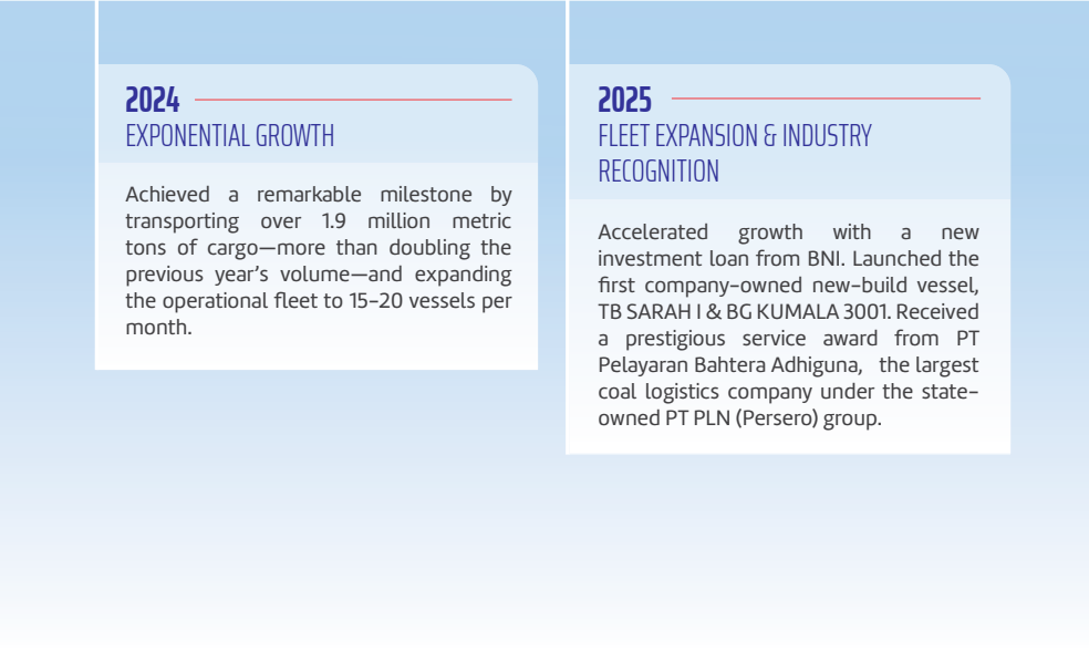 Our strength is anchored not only based on our experiences but also in the robust, long-standing relationships we cultivate with shippers, miners, government related institutions, fleet owners, and shipping agencies. With operations centered in Indonesia, we offer deep local expertise paired with a global standard of service.